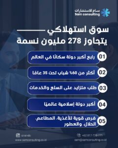 - فرص غير محدودة للمطاعم، والتجارة، والخدمات المختلفة. كما أنها أكبر دولة إسلامية في العالم، ما يجعلها سوقًا استثنائيًا لمنتجات مثل: التمور والعطور والبخور والمنتجات الحلال والسياحة الحلال.