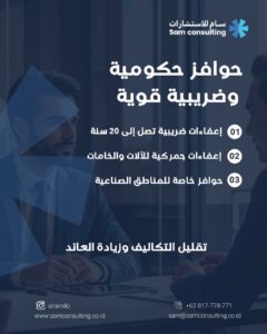 - حوافز خاصة للمستثمرين الذين ينشئون مصانع أو مشاريع داخل المناطق الصناعية. هذه المزايا تجعل تكلفة التشغيل أقل والعائد أعلى.